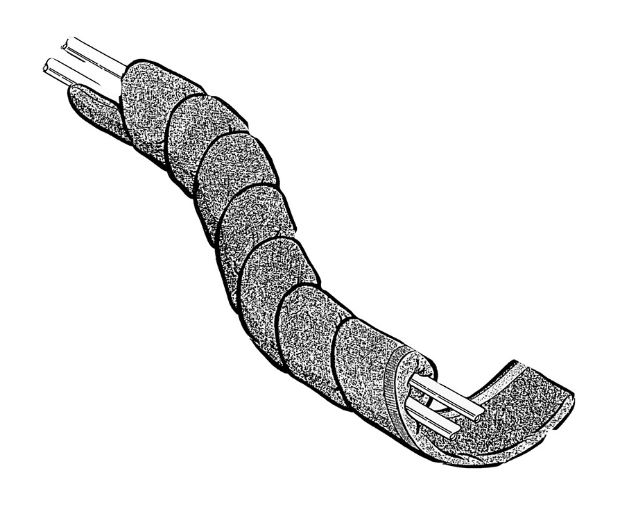 Installation of Modulated SPIRORAP® is quick and easy. The strip is spiraled on itself creating a solid cover with overlapping spirals. When the sewn-in hook and loop fasteners are used, every spiral is hooked onto the previous one, forming a closed cover. When no hook and loop fasteners are present, the spirals need to be fastened with standard electrical plastic ties which, when tightened, will hold the spirals together.